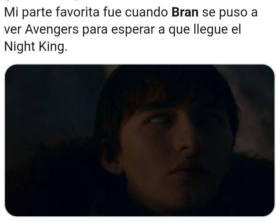 Para mi debió haber habido una pelea previa, no se, los caminantes vs los stark, sansa usando armadura y espada(sophie Turner dijo que iba a luchar en la batalla y no pasó nada), bran usando sus poderes qls de warg, John siendo John, y arya dando el golpe final, para la importancia que tenía este capítulo, esta batalla, metiendo historias y weas místicas durante 8 temporadas para que se terminará todo en 5 segundos?