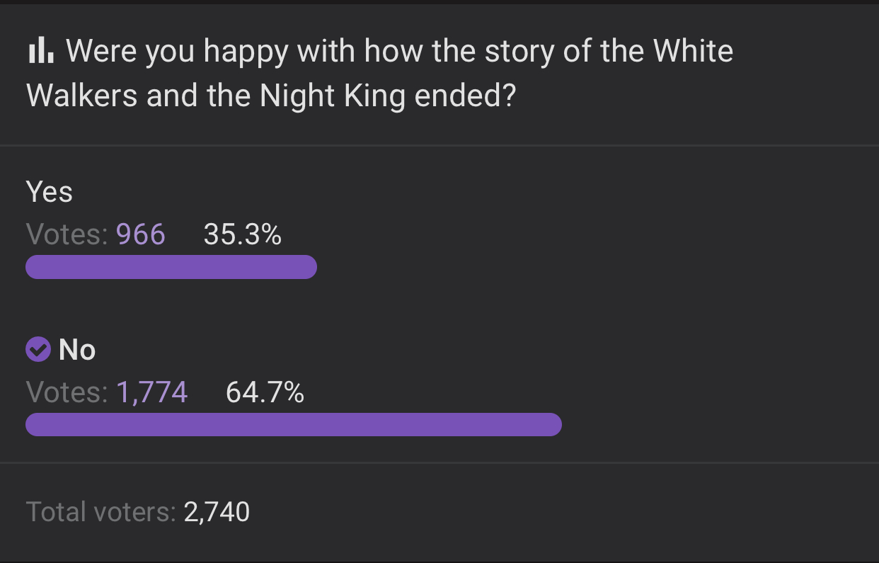 Yo todavía no entiendo por que tanto show con la muerte del NK/WW. que realmente esperaban? Que esos personajes lleguen hasta el último episodio? Desde que Bran se ofreció como carnada era obvio que el objetivo era terminar con los WW.
