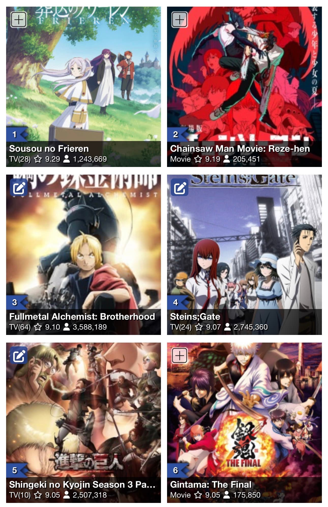 La s1 de Frieren y la película de Chainsaw Man hacen casi todo bien en lo que se le pide. La pura s1 de Frieren tiene 700k de votos y la de FMA anda por los 2m, que no se alineen con tus gustos es un tema aparte.