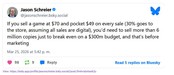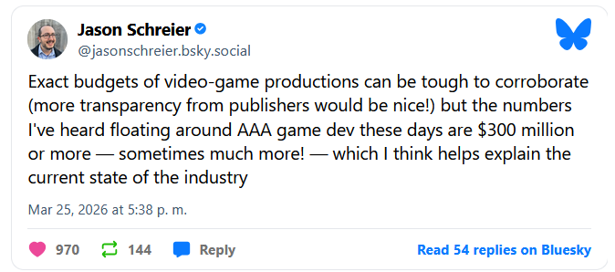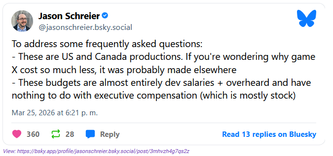 jason schreier estuvo posteando unos datos interesantes sobre el estado actual de la industria gringa y canada, el presupuesto estimado de un AAA es como de $300 million en promedio y casi todo el presupuesto se va en sueldos (los sueldos en esos paises son altisimos), con esos numeros para que a un juego le vaya bien por lo general deben vender como 6 millones, juegos que han sido exitos y que se venden a menos precio pues vienen de otros paises, seguro el AI que tanto odian solo viene para quedarse por que estos numeros no se van a sostener nicagando en el tiempo