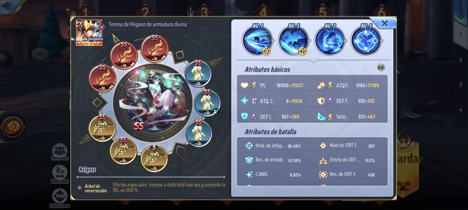 Buscándole velocidad también pero siempre debe quedar detrás de serafina, a la que le puse lunas nuevas en los azules, el cosmos nuevos en el centro, seiya amarillos y rojo ese nuevo que da perforación y velocidad pero por que tenía unos buenos con 3 sub atributos de prob. de inflingir estado y velocidad